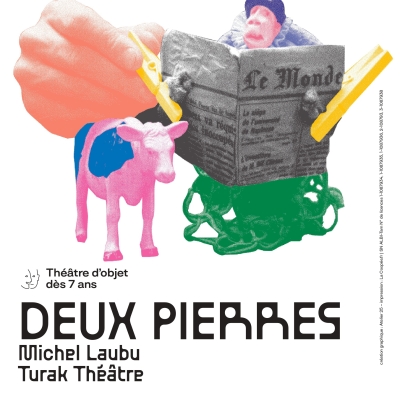 Deux pierres, ça tient tout entier dans la paume d’une main ou dans une boîte à chaussures. Ici, pinces à linge rouillées, bouts de ficelle enroulés, bois flotté, noyaux sculptés, mélange imprévu d’objets usés, exhumés des tiroirs oubliés, sont métamorphosés par l’imaginaire du Turak Théâtre. Fasciné par la poésie des petits assemblages improbables et par la fatigue des objets, Michel Laubu est un marionnettiste-inventeur, un fabricateur de spectacles à la croisée du théâtre de marionnette et du théâtre gestuel. Dans ce spectacle de poche au décor minimal, les scènes évoluent au gré de l’imaginaire nomade de l’auteur-rêveur-interprète qui relate quatre courtes épopées : un voyage au pays des anges, une tempête au bord de la mer, une promenade bucolique dans la campagne et les péripéties d’un vagabond qui a trouvé un caillou pour refuge. Des univers fantasques, loufoques, tous empreints d’une douceur infinie – c’est la définition du beau pays de la Turakie.