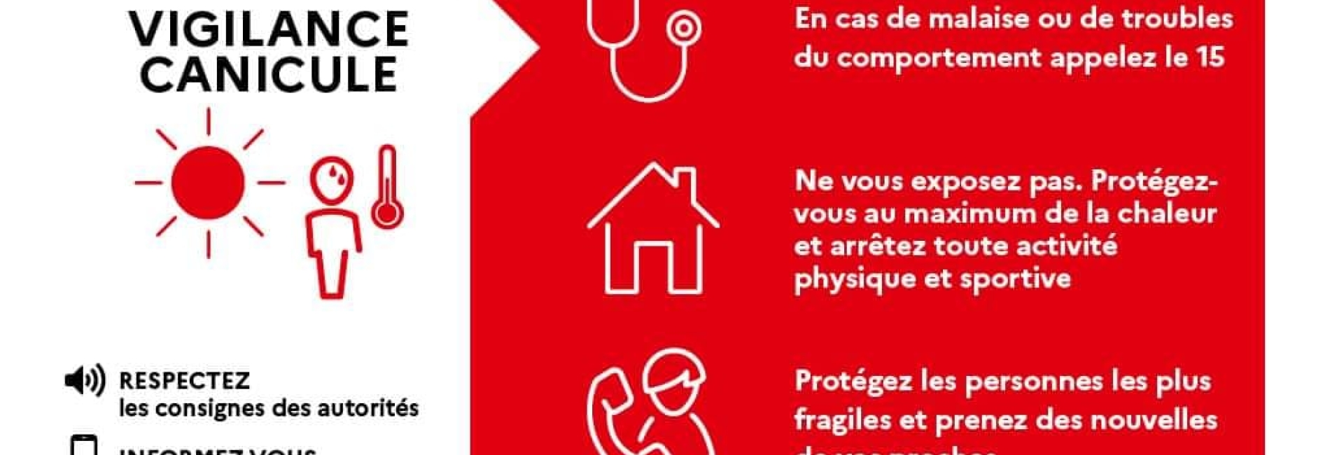 Les informations nécessaires pour se protéger : https://sante.gouv.fr/sante-et-environnement/risques-climatiques/article/les-recommandations-en-cas-de-vague-de-chaleur
